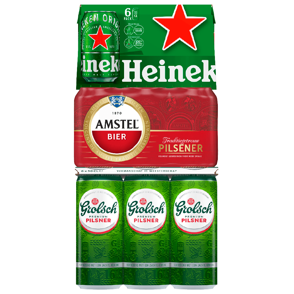 Bijv. Heineken Pils, set 6 blikjes à 33 cl van 6.99 voor 5.25.