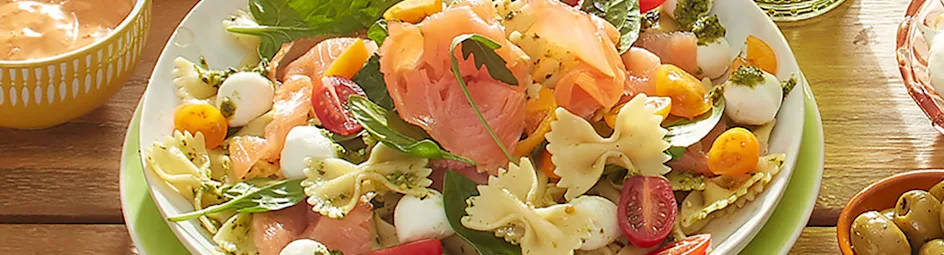 Pastasalade met gerookte zalm, mozzarella, babyspinazie en pesto