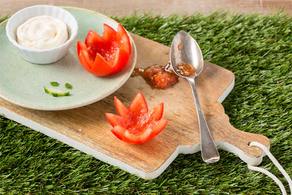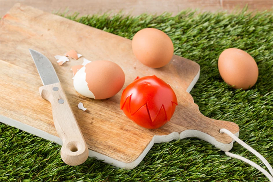 Snijd de tomaat zig zag in met een klein puntig en scherp mesje. Trek de 2 delen van elkaar. Kook ondertussen de eieren hard, spoel koud en pel ze.