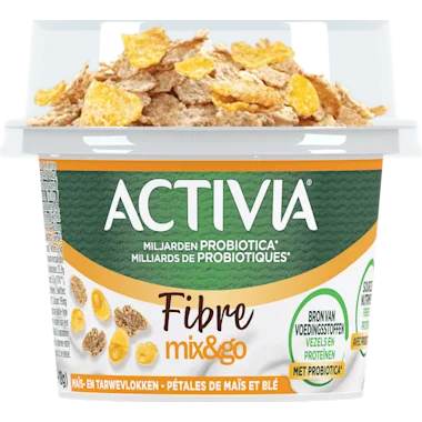 Activia Fibre Mix & Go met Maïs en Tarwevlokken. Dat is de unieke zachtheid van Activia, in combinatie met krokante granen met miljarden probiotica*. Bron van voedingsstoffen, vezels en proteïnen. Lekker om gewoon thuis van te genieten, maar ook handig voor onderweg!