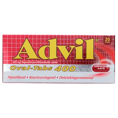 Advil Reliva Forte Oval-Tabs 400 mg, voor effectieve en langdurige pijnverlichting tot 8 uur lang. Door de ovale, gladde vorm is detablet gemakkelijk te slikken en blijft er geen nare smaak achter. Geschikt voor onder andere hoofdpijn, rugpijn, kiespijn, menstruatiepijn, reumatische pijn, spierpijn, verlichting van koorts en de symptomen van verkoudheid en griep. Werkt ontstekingsremmend, koortsverlagend en pijnstillend.
