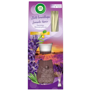 1. Trek de bovenste dop van het flesje af door deze omhoog te trekken. 2. Verwijder de plastic zegel van het flesje. 3. Plaats de bovenste dop terug op het flesje. 4. Steek de geurstokjes in de opening van het flesje. 5. Zet het flesje rechtop op een vlakke ondergrond en laat de stokjes de geur verspreiden.