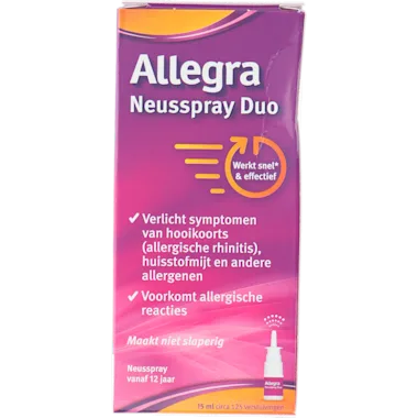 Allegra Neusspray Duo verlicht symptomen van hooikoorts (allergische rhinitis), huisstofmijt en andere allergenen. Allegra Neusspray Duo voorkomt allergische reacties.