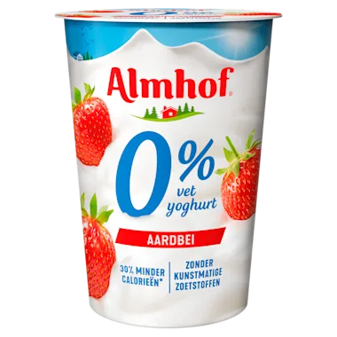 *Almhof 0% vet yoghurt bevat tenminste 30% minder calorieën dan gewone fruityoghurts.