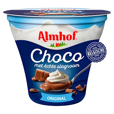 Almhof Choco met slagroom Original is een romig chocolade dessert met. Gemaakt met Belgische chocolade, en een toef échte slagroom. Dat is pas écht genieten!