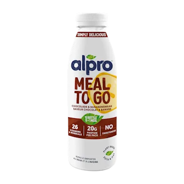Soja- en haverdrinkmaaltijd, chocolade- en bananensmaak, met toegevoegde mineralen en vitaminen, gesteriliseerd UHT.
