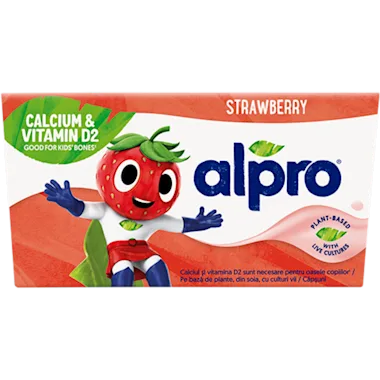 Gefermenteerd sojaproduct, aardbei, met toegevoegde calcium, jodium en vitaminen B2, B12, D2. Bron van calcium en vitamine D2.