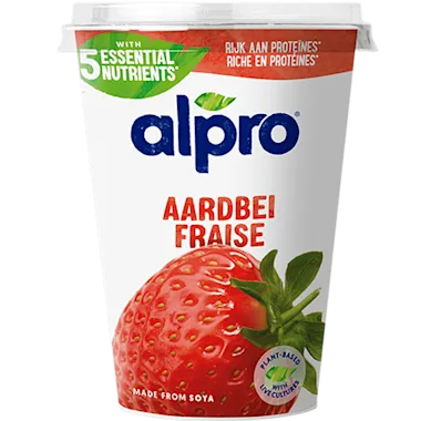 Alpro plantaardige variatie op yoghurt aardbei heeft een milde textuur gecombineerd met van heerlijke stukjes aardbei. Heerlijk op ieder moment van de dag!