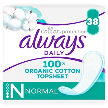 Always Dailies Cotton Protection Inlegkruisjes Normal hebben een 100% biologisch katoenen toplaag. De inlegkruisjes bevatten geen parfum en kleurstoffen. Ze hebben een comfortabel, dun en flexibel design en een absorberende kern. Ze zijn gemaakt van ademend materiaal. Ze zijn goedgekeurd door de dermatologen van SHA (Skin Health Alliance) en zijn gecertificeerd door Cotton Inc. Ga voor meer informatie over onze producten naar onze website.