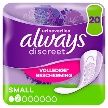 Always Discreet verband voor urineverlies Small biedt volledige* bescherming en een discrete pasvorm. Elk verband is ontworpen om betrouwbare bescherming tegen lekken te bieden, geurtjes te neutraliseren en onmiddellijk te absorberen. Bovendien is het zacht voor de huid en sluit het mooi aan op je lichaam. Always Discreet verband Small Plus biedt optimale bescherming en discretie, zodat je je zelfverzekerd kunt voelen wanneer lachen of niezen urineverlies veroorzaakt. *Gebaseerd op onze 5 dimensies van bescherming: betrouwbare bescherming bij urineverlies, onmiddellijke absorptie, bescherming tegen geurtjes, discreet design, zacht voor de huid