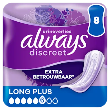 Ideaal voor veel urineverlies. Always Discreet verbanden voor urineverlies Long Plus bieden extra zekerheid. Ze zijn ontworpen om je extra bescherming en absorptie te bieden, zodat je je geen zorgen hoeft te maken over lekken. Hun structuur zorgt voor optimale bescherming dankzij hun ultradunne kern, zodat je niet hoeft te kiezen tussen comfort en bescherming. Always Discreet verband Long Plus biedt optimale bescherming wanneer niezen of lachen urineverlies veroorzaakt.