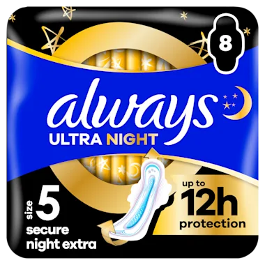 Geniet van een ongestoorde nachtrust en zeg ja tegen tot 12 uur bescherming: ALWAYS Ultra Secure Night Extra maandverbanden (maat 5) met vleugels en een zacht aanvoelende absorberende toplaag hebben 3 beschermingskenmerken zodat je ’s nachts niet hoeft op te staan om te controleren of je maandverband lekt of om het te vervangen. Een 9% grotere voorkant en 85% grotere achterkant (in vergelijking met Always Ultra Normal maat 1) in combinatie met onze LeakGuard technologie zorgen ervoor dat je de hele nacht beschermd bent zonder lekken. Always Ultra maandverbanden zijn goedgekeurd door de dermatologen van de Skin Health Alliance.