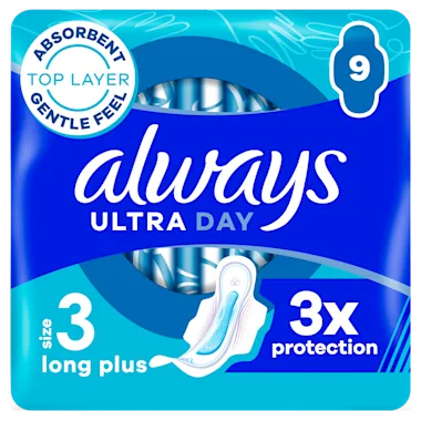 Neem geen genoegen met minder dan drievoudige bescherming met ALWAYS Ultra Long Plus (maat 3) maandverband. De Always maandverbanden met hun zacht aanvoelende absorberende toplaag absorbeert vocht in enkele seconden dankzij de InstantDry technologie en voorkomt lekken en geurtjes dankzij de LeakGuard en OdourBlock technologieën. Hun unieke ComfortLock vleugels zijn ontworpen om goed in elk soort ondergoed te passen. Probeer Always Night maten voor extra bescherming ’s nachts. Always Ultra maandverbanden zijn goedgekeurd door de dermatologen van de Skin Health Alliance.
