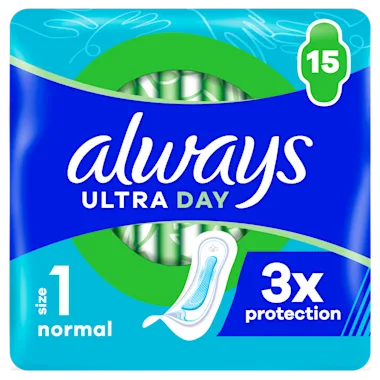 Neem geen genoegen met minder dan drievoudige bescherming met ALWAYS Ultra Day Normal (maat 1) maandverband. De Always maandverbanden met hun zacht aanvoelende absorberende toplaag absorbeert vocht in enkele seconden dankzij de InstantDry technologie en voorkomt lekken en geurtjes dankzij de LeakGuard en OdourBlock technologieën. Probeer Always Night maten voor extra bescherming 's nachts. Always Ultra maandverbanden zijn goedgekeurd door de dermatologen van de Skin Health Alliance.