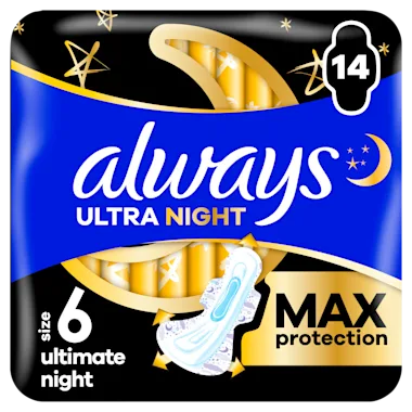 Geniet van een ongestoorde nachtrust: Always Ultimate Night maandverband (maat 6) met vleugels biedt maximale bescherming zodat je 's nachts niet moet opstaan om te controleren of je maandverband lekt of om het te vervangen. Ons langste en breedste maandverband is voorzien van LeakGuard technologie en absorbeert 3x zoveel (vs. Always Ultra Day Normal) om 's nachts lekken te voorkomen.  Het InstantDry-systeem absorbeert vocht in enkele seconden en houdt het weg van de huid. Het is ook voorzien van een ComfortFit-systeem en extra vleugels aan de achterkant, zodat je maandverband op zijn plaats blijft zitten terwijl je slaapt.