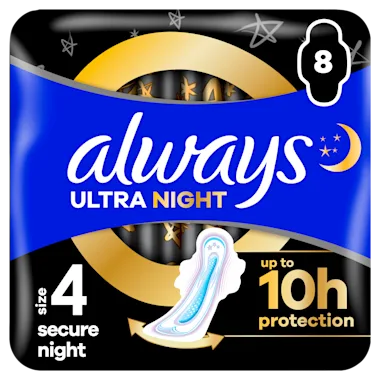 Geniet van een goede nachtrust en zeg ja tegen tot 10 uur lang bescherming: Always Ultra Secure Night maandverbanden (maat 4) met vleugels en een zacht aanvoelende absorberende toplaag hebben 3 beschermingskenmerken zodat je ’s nachts niet hoeft op te staan om te controleren of je maandverband lekt of om het te vervangen. Een 60% grotere achterkant (in vergelijking met Always Ultra Normal maat 1) in combinatie met onze LeakGuard technologie helpt lekken en geurtjes 's nachts voorkomen. Always Ultra maandverbanden zijn goedgekeurd door de dermatologen van de Skin Health Alliance.