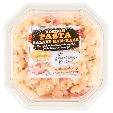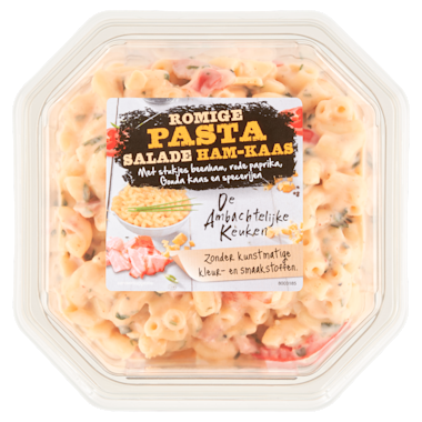 Ingrediënten: gekookte pasta (43%) (TARWEgriesmeel, scharrelEI-eiwit, water), water, rode paprika, raapolie, kaas (5%) (melk, zout, zuursel, conserveermiddel (natriumnitraat), stremsel, kleurstof (bètacaroteen)), ham (4%) (gekookt varkensvlees, water, zout, aardappelzetmeel, conserveermiddelen (natriumacetaten, kaliumacetaat, natriumnitriet), dextrose), suiker, azijn, maïszetmeel, zout, vrije uitloopEIeigeel, gemodificeerd maïszetmeel, specerijen, conserveermiddelen (kaliumsorbaat, natriumbenzoaat), kruiden, voedingszuur (melkzuur), verdikkingsmiddel (xanthaangom). Kan pinda en walnoten bevatten.