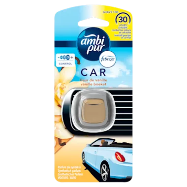 Ambi Pur Auto met OdourClear-technologie zuivert de lucht in je auto voortdurend van hardnekkige geuren en laat tot 30 dagen een lichte, frisse geur achter. Zorg voor een gastvrije sfeer met deze crèmige vanillegeur. Dit geurtje is geïnspireerd door koffiehuizen en herinnert aan opgeschuimde melk en vanille. In tegenstelling tot andere autoverfrissers die geuren vooral maskeren, zuivert de Ambi Pur autoluchtverfrisser de lucht echt van geuren en laat hij je auto heerlijk fris ruiken. Het is een klein, discreet apparaat dat eenvoudig in het ventilatiesysteem van je auto klikt. Dankzij zijn unieke OdourClear-technologie zuivert hij de lucht van geuren en elimineert hij zelfs de hardnekkigste geuren in je auto, zoals die van eten, huisdieren, rook of afval. Je kunt zelfs met behulp van de draaiknop op de zijkant de geursterkte controleren. Ambi Pur Auto is makkelijk te gebruiken, heeft geen batterij of elektriciteit nodig en werkt tot 30 dagen lang zodat jij en je gasten met een glimlach kunnen ademen. Probeer het volledige assortiment Ambi Pur producten met de unieke OdourClear-technologie waaronder de Ambi Pur Textielverfrisser om geuren uit je autobekleding te elimineren, of de Ambi Pur Luchtverfrisser en Kleine Ruimtes voor je huis. Probeer ook de 3Volution Elektrische Luchtverfrissers voor de voortdurende eliminatie van geuren, tot 90 dagen lang.