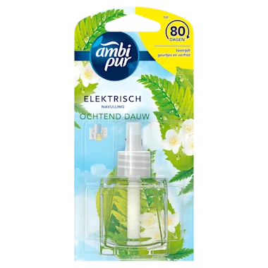 De Ambi Pur elektrische luchtverfrisser navulling met OdourClear-technologie zuivert de lucht voortdurend van hardnekkige geuren en laat tot 80 dagen een lichte, frisse parfum achter (indien 12 uur per dag gebruikt op stand 2). De parfum Ochtend Dauw is geïnspireerd op de frisheid van een vroege ochtendwandeling. Creëer de sfeer die je wil met de Ambi Pur Elektrisch en zijn uitgebreide assortiment kwaliteitsvolle parfums die de lucht echt van geuren zuivert zodat jij en je gasten van een authentieke parfum en een frisse ervaring kunnen genieten. Gebruik de Ambi Pur Elektrisch - navullingen alleen met de Ambi Pur geurverspreiders, apart verkocht, om je huis te vullen met een frisheid en parfum die je dag na dag, week na week blijft ruiken. Probeer voor onmiddellijke frisheid het volledige assortiment Ambi Pur producten met de unieke OdourClear-technologie waaronder de Ambi Pur textiel-, lucht- en autoverfrisser.