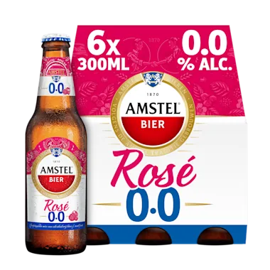 Amstel Rosé 0.0% is een frisse mix van alcoholvrij Amstel bier en rood fruit, heerlijk fruitig met 0% alcohol. Voor onvergetelijke momenten met vrienden.