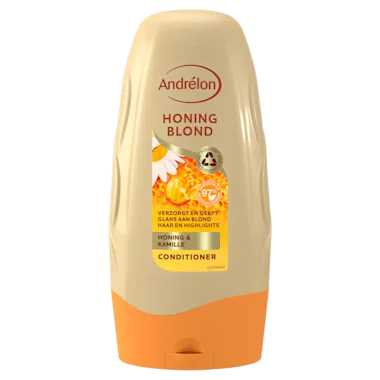 De Andrélon Honing Blond Conditioner verrijkt met kamille en honing zorgt voor heerlijk verzorgd vol en sterk blond haar met een natuurlijke glans. De conditioner met uv-filter is speciaal ontwikkeld voor de verzorging van blond haar en highlights. De conditioner is gemaakt met 97% ingrediënten van natuurlijke oorsprong*. Deze fles en dop zijn 100% recyclebaar, gooi de fles dus weg bij het plasticafval.