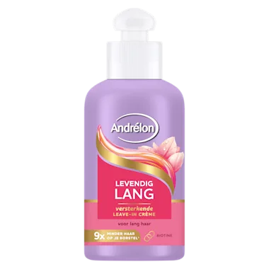 Wist je dat lang haar kwetsbaar is tijdens het borstelen? Ontdek de Andrélon Levendig Lang Versterkende Leave-in Haarcrème, een musthave voor iedereen die snel last heeft van lang haar dat snel breekt. Deze versterkende leave-in crème, verrijkt met biotine, is ontworpen om de haarvezels te beschermen en te versterken, waardoor lang haar minder snel breekt en er tot 9x minder haar op je borstel achterblijft*. Zorg goed voor je lange lokken, geef ze de bescherming die ze verdienen en laat ze weer dansen!