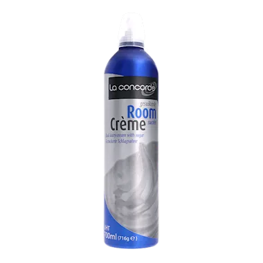 Room. Suiker 10%, drijfgassen: E941, E942, emulgator: E471, stabilisatoren: E407