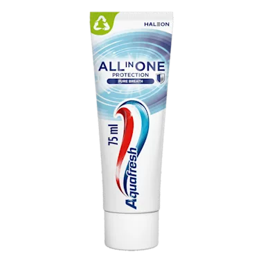 Ga verder dan een frisse adem, ga voor een pure adem. Aquafresh All-in-One Protection Pure Breath vermindert 80% van de slechte ademgeuren.*** Met frisse muntsmaak voor het hele gezin.