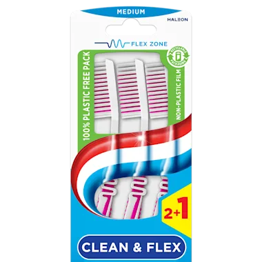 Poets je tanden en kiezen grondig en spaar je tandvlees met de afgeronde borstelharen. De Aquafresh Clean & Flex tandenborstel reinigt dankzij de afgeronde borstelharen je tanden en kiezen grondig , waarbij de Flex Zone en Ball Joint helpen de druk op je tandvlees tijdens het poetsen te controleren om het tandvlees te beschermen. De flexibele steel helpt beschadiging van je tandvlees en tandvleeshalzen, als gevolg van te hard poetsen, voorkomen. De tandenborstel verwijdert tandplak en is zacht voor je tandvlees.
