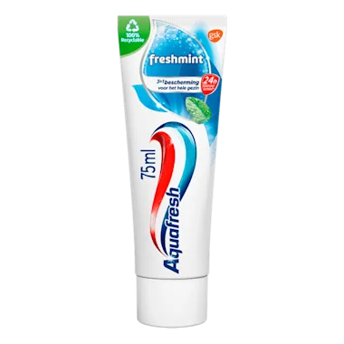 Aquafresh freshmint tandpasta wordt geleverd in een recyclebare plastic tube en dop