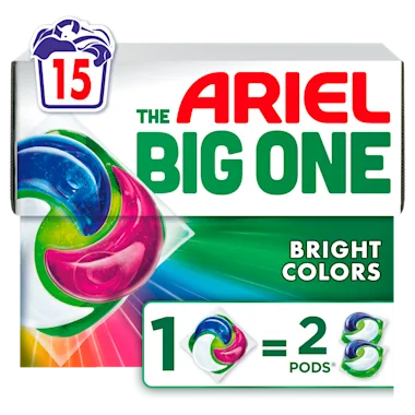 Ontdek Ariel The Big One PODS wasmiddelcapsules Stralende Kleuren, met 2X zoveel vlek- & geurverwijdering (de werking van the Big One staat gelijk aan 2 Ariel Original 3in1 PODS). U krijgt de maximale reiniging van Ariel bij minimale inspanning: speciaal ontworpen voor gemengde wasbeurten; u hoeft nooit opnieuw te wassen, zelfs niet bij de volste en zwaar bevuilde was. Bovendien zijn de pods zo ontworpen dat ze briljant werken, zelfs op lagere temperaturen: ze lossen snel op, zelfs in koud water, en leveren een onberispelijke resultaat. Was kouder en bespaar tot 60% op de elektriciteitskosten van uw wasmachine (energieverbruik wasmachine van 60 tot 30 °C, normale cyclus). Leg voor het beste resultaat eerst de pod achterin de trommel en dan de kleding er bovenop. Houd Ariel The Big One PODS altijd buiten het bereik van kinderen. Ga naar keepcapsfromkids.eu voor meer informatie.