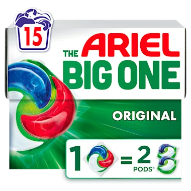 Ontdek Ariel The Big One PODS wasmiddelcapsules Original, met 2X zoveel vlek- & geurverwijdering (de werking van Ariel the Big One staat gelijk aan 2 Ariel Original 3in1 PODS). U krijgt de maximale reiniging van Ariel voor minimale inspanning: met de geïntegreerde voorbehandeling hoeft u nooit opnieuw te wassen, zelfs de zwaar bevuilde was. Bovendien zijn de pods zo ontworpen dat ze briljant werken, zelfs op lagere temperaturen: ze lossen snel op, zelfs in koud water, en leveren een onberispelijke resultaat. Was kouder en bespaar tot 60% op de elektriciteitskosten van uw wasmachine (energieverbruik wasmachine van 60 tot 30 °C, normale cyclus). Leg voor het beste resultaat eerst de pod achterin de trommel en dan de kleding er bovenop. Houd Ariel The Big One PODS altijd buiten het bereik van kinderen. Ga naar keepcapsfromkids.eu voor meer informatie.