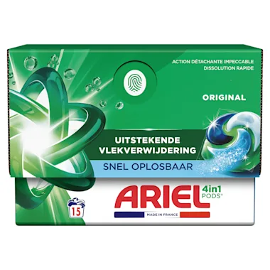 Ariel 4in1 PODS® wasmiddelcapsules Original bieden onberispelijke vlekverwijdering in 1 wasbeurt. Ze worden gemaakt in Frankrijk. Ariel 4in1 PODS® zijn ontworpen om uitstekend te werken, zelfs bij koude en korte wascycli. Ze lossen snel op in koud water en zorgen voor een langdurige frisse geur van schone was met onberispelijke resultaten. Koude cycli helpen ook om je stoffen langer te behouden (vs met cycli op hoge temperatuur). Voor optimale resultaten plaats je de Pod achterin de lege trommel en leg je je kleding erbovenop. Voor volle wasmachines van meer dan 5 kg en voor hardnekkige vlekken of geuren gebruik je 2 PODS®. Houd Ariel 4in1 PODS® wasmiddelcapsules altijd buiten het bereik van kinderen. Ga naar keepcapsfromkids.eu voor meer informatie.