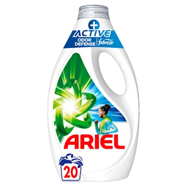 Ariel +Actieve Odor Defense vloeibaar wasmiddel geeft je de uitstekende schoonheid van Ariel terwijl het vlekken en geuren bestrijdt. Speciaal ontworpen met een vleugje Febreze en verwijdert zelfs zweetgeurtjes na 7 dagen. Ariel +Active Odor Defense vloeibaar wasmiddel biedt ook onberispelijke resultaten in koud water. Bovendien wordt Ariel vloeibaar wasmiddel geproduceerd in Frankrijk. Je kunt Ariel +Actieve Geurbestrijding vloeibaar wasmiddel ook gebruiken om vlekken voor te behandelen met de groene dop. Daarna stop je je kleding in de wasmachine. Voor de beste resultaten, vul de groene dop met Ariel vloeibaar wasmiddel op basis van het vulniveau van de trommel en plaats deze in de trommel, boven op je kleding. Om het milieu te beschermen krijgen niet alle flessen een doseerdop. Je kunt de dop gratis aanvragen via ariel.info.