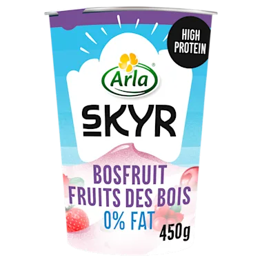 Arla Skyr Bosfruit is een heerlijke yoghurt in IJslandse stijl. Skyr is van nature rijk aan eiwit, bevat 0% vet en is toch lekker romig van smaak. Haal meer uit je ochtend met Arla Skyr.