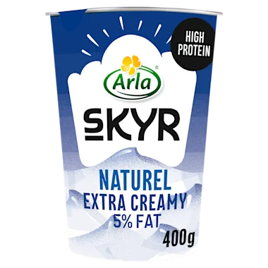 Arla Skyr Extra Creamy Naturel is een heerlijke yoghurt in IJslandse stijl met 5% vet. Skyr is van nature rijk aan eiwit en nu extra romig door de 5% vet. Haal meer uit je ochtend met Arla Skyr.