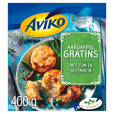 De Aviko Aardappel Gratins met Tijm & Rozemarijn (4 stuks) zijn heerlijk van smaak door de combinatie van aardappelschijfjes, room en kruiden. Met deze krokante en romige gratins maak je echt indruk. Onze aardappelen worden met zorg geselecteerd en verwerkt. Aardappelen bevatten belangrijke voedingsstoffen zoals koolhydraten, vezels, eiwitten en mineralen Aviko biedt voor elke dag inspiratie voor de avondmaaltijd. Hoe ziet jouw kookweek eruit? Kijk op www.aviko.nl voor verrassende kookweekrecepten.