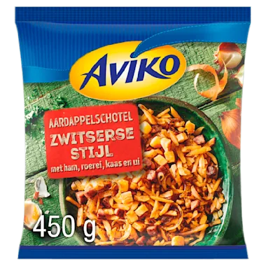 Aviko Aardappelschotel Zwitserse stijl is een heerlijk gerecht van rösti, ham, roerei, kaas en ui. Daarmee is deze aardappel schotel de perfecte basis voor je maaltijd. Onze aardappelen worden met zorg geselecteerd en verwerkt. Aardappelen bevatten belangrijke voedingsstoffen zoals koolhydraten, vezels, eiwitten en mineralen Aviko biedt voor elke dag inspiratie voor de avondmaaltijd. Hoe ziet jouw kookweek eruit? Kijk op www.aviko.nl voor verrassende kookweekrecepten.