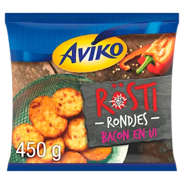 Aviko Rösti Rondjes Bacon & Ui zijn gemaakt van licht gekruide rösti met knapperige stukjes bacon en ui. Eenvoudig te bereiden en er kan eindeloos mee gevarieerd worden in wok- en ovenschotels. Onze aardappelen worden met zorg geselecteerd en verwerkt. Aardappelen bevatten belangrijke voedingsstoffen zoals koolhydraten, vezels, eiwitten en mineralen Aviko biedt voor elke dag inspiratie voor de avondmaaltijd. Hoe ziet jouw kookweek eruit? Kijk op www.aviko.nl voor verrassende kookweekrecepten.