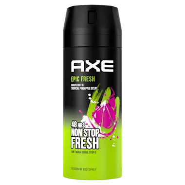 Breng fris blijven naar een hoger niveau met AXE Epic Fresh Deodorant Bodyspray. Leef het dagelijkse frisse leven. Je weet nooit wat er kan gebeuren, dus heb je een bodyspray nodig om de hele dag heerlijk te blijven ruiken. AXE Epic Fresh Deodorant Bodyspray met geurbestrijdende zink, verhoogd met 5% Zink-Zap technologie, stopt ongewenste lichaamsgeur en geeft je langdurige bescherming. Geniet 48 uur lang van de stimulerende frisse geur van grapefruit en tropische ananas. Wat er ook op je pad komt, met AXE ben je er klaar voor. De hele dag door.
