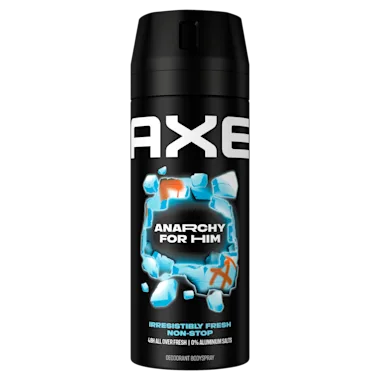 AXE Anarchy for Him Deodorant Bodyspray voor een ongeëvenaard fris gevoel. Leef dat dagelijkse frisse leven. Je weet nooit wat er kan gebeuren, dus heb je een bodyspray nodig om de hele dag heerlijk te blijven ruiken. AXE Anarchy for Him Bodyspray met geurbestrijdende zink en 5% extra Zink-Zap technologie stopt ongewenste lichaamsgeur en geeft je langdurige bescherming. Geniet 48 uur lang van de sensuele geur van granaatappel en sandelhout. Wat er ook op je pad komt, met AXE ben je er klaar voor. De hele dag door.