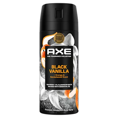 Met AXE Fine Fragrance Collection Black Vanilla Premium Deodorant Bodyspray ruik je onweerstaanbaar. Breng fris blijven naar een hoger niveau. Leef dat dagelijkse frisse leven. Je weet nooit wat er kan gebeuren, dus heb je een deodorant bodyspray nodig die ervoor zorgt dat je de hele dag heerlijk ruikt, elke dag weer. Deze bodyspray met de onweerstaanbare geur van sinaasappel en sandelhout is net zo fris als een luxe parfum! En AXE Black Vanilla Deodorant Bodyspray beschermt je daarbij ook nog eens 72 uur lang tegen ongewenste lichaamsgeurtjes. AXE Black Vanilla Premium Deodorant Bodyspray is een van de premiumgeuren uit onze AXE Fine Fragrance Collection-lijn. Dit assortiment, met natuurlijke essentiële oliën en 2 keer meer geurbestrijdende zink-technologie dan onze standaard deodorant bodyspray, is gecreëerd door meesterparfumeurs. Met deze deodorant-bodysprays ruik je net zo onweerstaanbaar als met een luxe parfum, terwijl je tegelijkertijd de bescherming hebt van een deo.