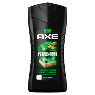 De AXE Green Mojito & Cedarwood 3-in-1 Douchegel met de frisse geur van citrus, munt en een vleugje cederhout zorgt voor een verfrissende en relaxte verzorging en reiniging van je lichaam, gezicht en haar. De douchegel verwijdert bacteriën en laat je tot wel 12 uur lang onweerstaanbaar ruiken. AXE Green Mojito & Cedarwood 3-in-1 Douchegel met toegevoegde moisturizers is dermatologisch getest en bevat 87% ingrediënten van natuurlijke oorsprong**. Met AXE-douchegel start je de dag of de avond goed. Geniet je van deze geur? Probeer dan ook eens de AXE Green Mojito & Cedarwood Deodorant Bodyspray. De douchegel van Axe is verpakt in een 100% gerecyclede* en recyclebare fles.