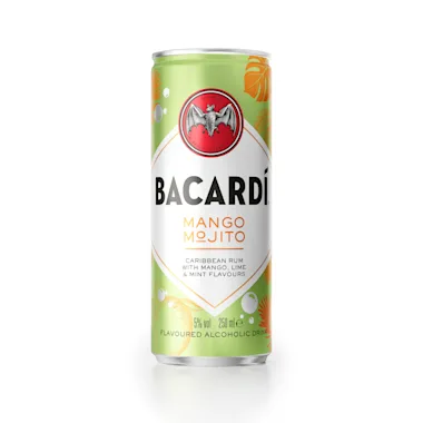 BACARDI Mango Mojito Rum Cocktail is een heerlijke cocktail in blik met een fruitige, exotische twist. Gemaakt met BACARDI Carta Blanca Rum, bruisend water, natuurlijke aroma's en echte ingrediënten.