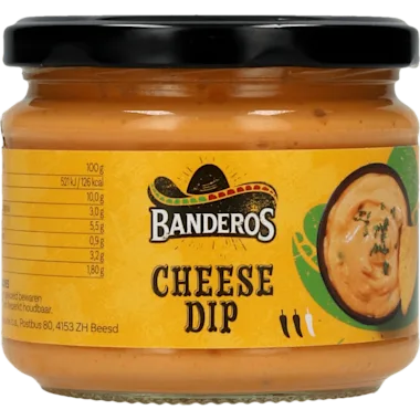 Ingrediënten :water, 10% smeltkaas (kaas (MELK, zuursel, zout, dierlijk stremsel), water, boter (MELK), MELKEIWIT, aardappelzetmeel, smeltzout: E452, antioxidant: E331, kleurstof: E160c), raapzaadolie, gemodificeerd maïszetmeel, rode paprika, MELKEIWIT, ui, zout, kokosolie, natuurlijke aroma's (bevat MELK), 0,6% jalapeno peper, tomatenpasta, groene chilipeper, emulgator: E472e, stabilisator: E415/E412, emulgator: E452i, voedingszuur: E330, specerijen (komijn, cayennepeper), kruidenextract (oregano), kleurstof: paprika-extract.