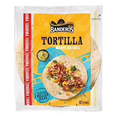 2. Verhit de tortilla's gedurende 10 tot 15 seconden in de magnetron op 700W of bak beide zijden 10 tot 15 seconden in een droge pan.