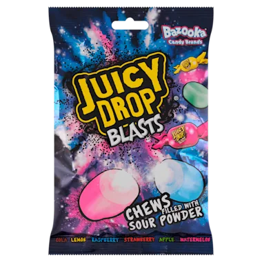 Kauwsnoepgoed met fruitsmaak gevuld met zuur poeder.