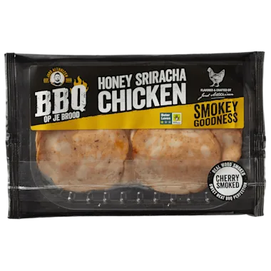86% kippenvlees¹, SMOKEY GOODNESS CHEEKY CHICKEN (specerijen, suiker, kruiden, zout, ui, natuurlijk aroma, honing), aardappelzetmeel, zout, honing(maltodextrine), conserveermiddel (E261, E250), dextrose, stabilisatoren (E450, E452), tomaten ketchup (tomatenpuree, glucose-fructosestroop, natuurazijn, gemodificeerd maïszetmeel, specerijen), sriracha sauce (water, kruiden en specerijen, suiker, zout, azijn, gemodificeerd aardappelzetmeel, voedingszuur (E330), conserveermiddel (E202)), natuurlijke aroma's, specerij, gistextract, antioxidant (E301), rook, specerij-extracten, korianderextract, water ¹ = Beter Leven Keurmerk 1 ster
