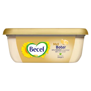 Ingrediënten: plantaardige oliën (raapzaad, zonnebloem in wisselende verhoudingen), water, kokosolie, BOTER 8.5%, KARNEMELK, zeezout 0.3%, emulgator (lecithine), natuurlijk aroma, natuurlijke kleurstof (caroteen), vitamines A, B1, D,