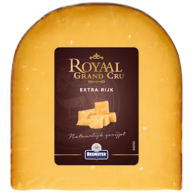 Beemster Signature Royaal Grand Cru is een stevige, licht brokkelige kaas die ongeveer 12 maanden op sparrenhouten planken rijpt. Unieke aroma‘s combineren met een subtiel smeltende, romige textuur. Fijne rijpingskristallen maken van deze koninklijke kaas een unieke specialiteit. Beemster kaas is bereid met 100% verse Noord-Hollandse weidemelk, lokaal gemaakt in de Beemster polder. Een stuk Beemster Signature Royaal Grand Cru is op verschillende manieren te gebruiken. Op de borrelplank, samen met bijvoorbeeld droge worst, druiven en fruit-notenbrood. Of rasp het stuk kaas over een pastagerecht voor extra smaak.